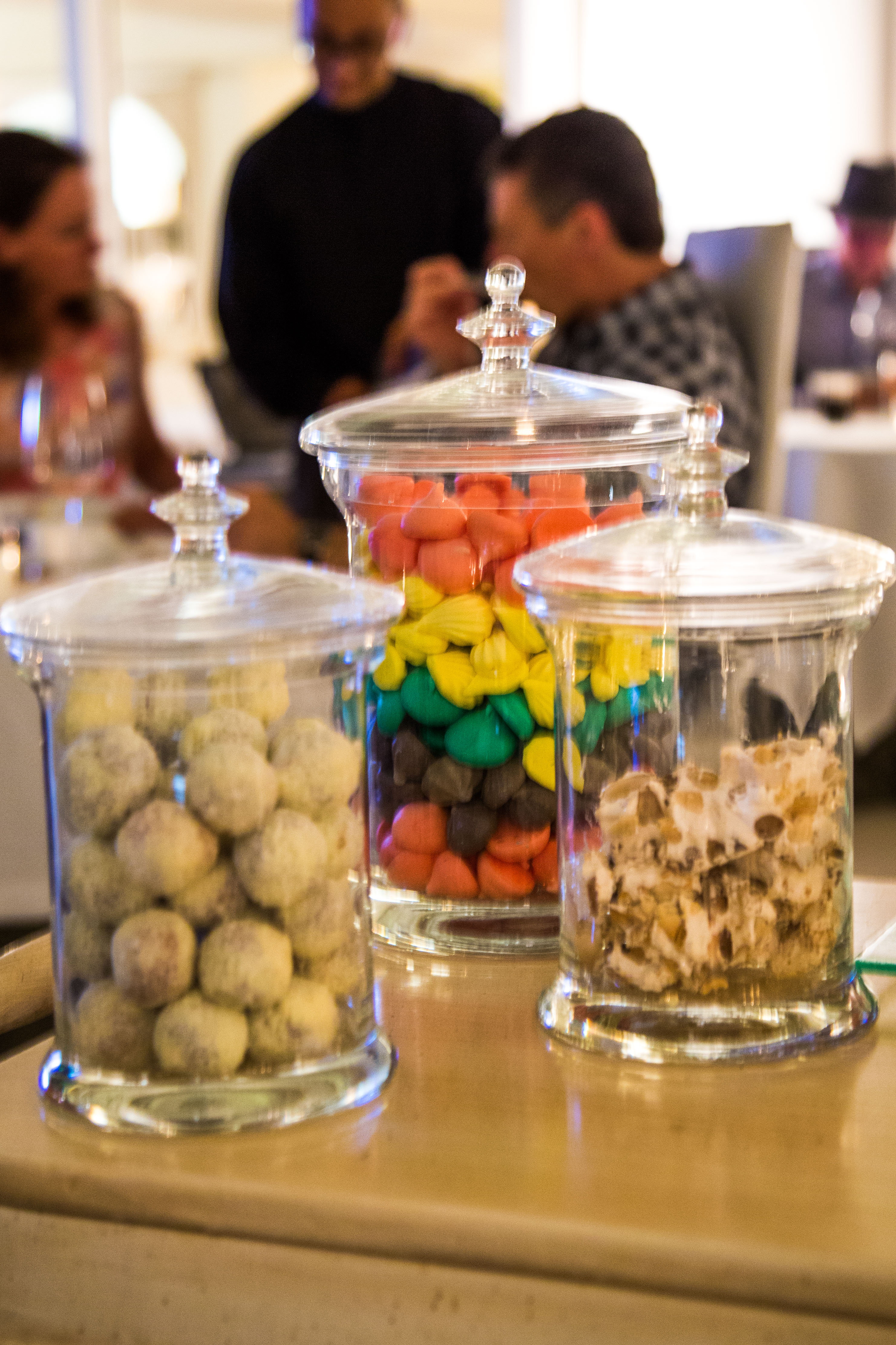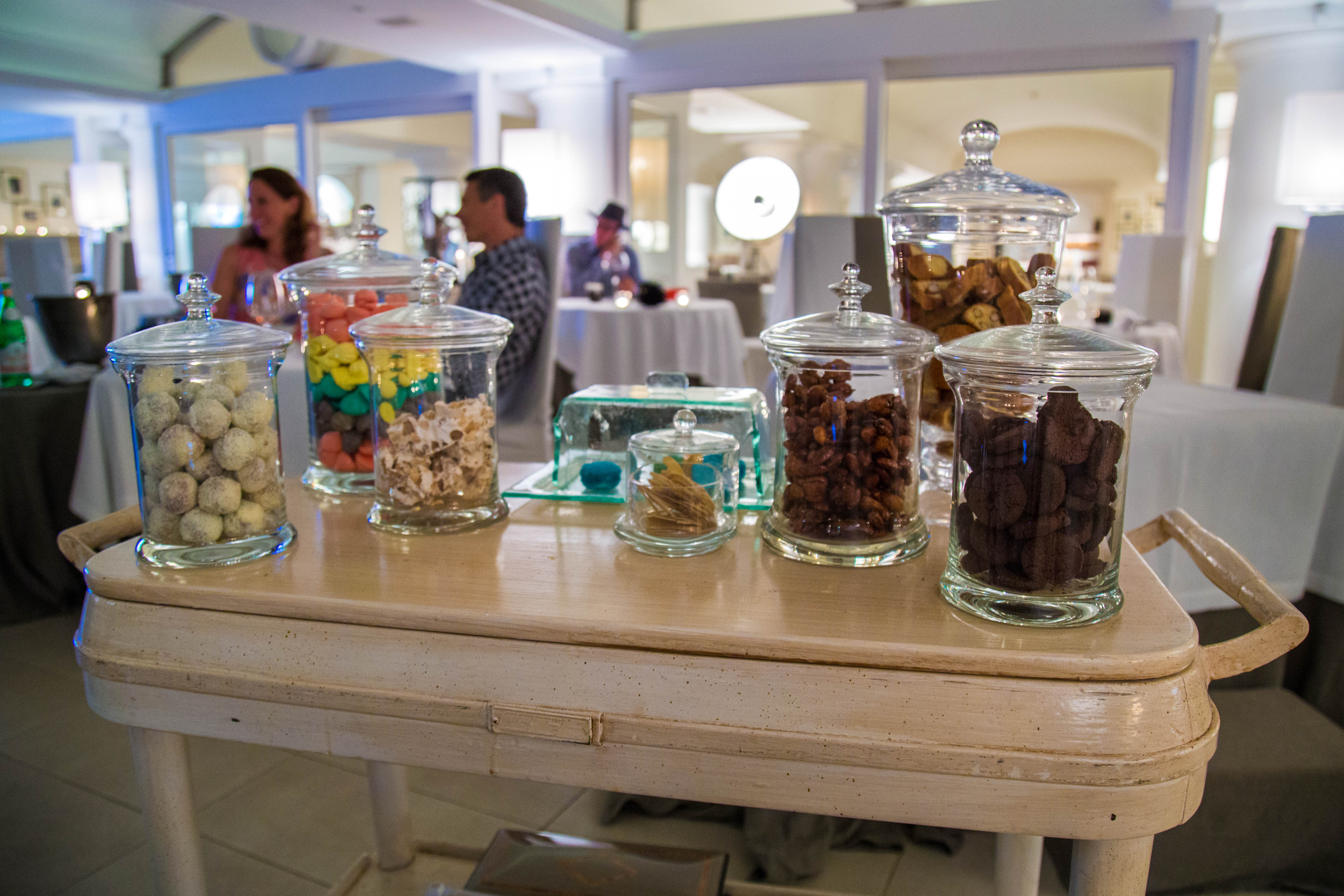 Um carrinho de doces chega com os mais variados tipos de biscoitinhos, chocolates e tudo o que você pode imaginar. A equipe, que parece ter visto a nossa cara de “ai… não acredito que não vamos conseguir provar os docinhos” logo pega um saquinho de balas e fala: que tal guardarem pra comer amanhã? É só escolher.. Querem um pouquinho de tudo?