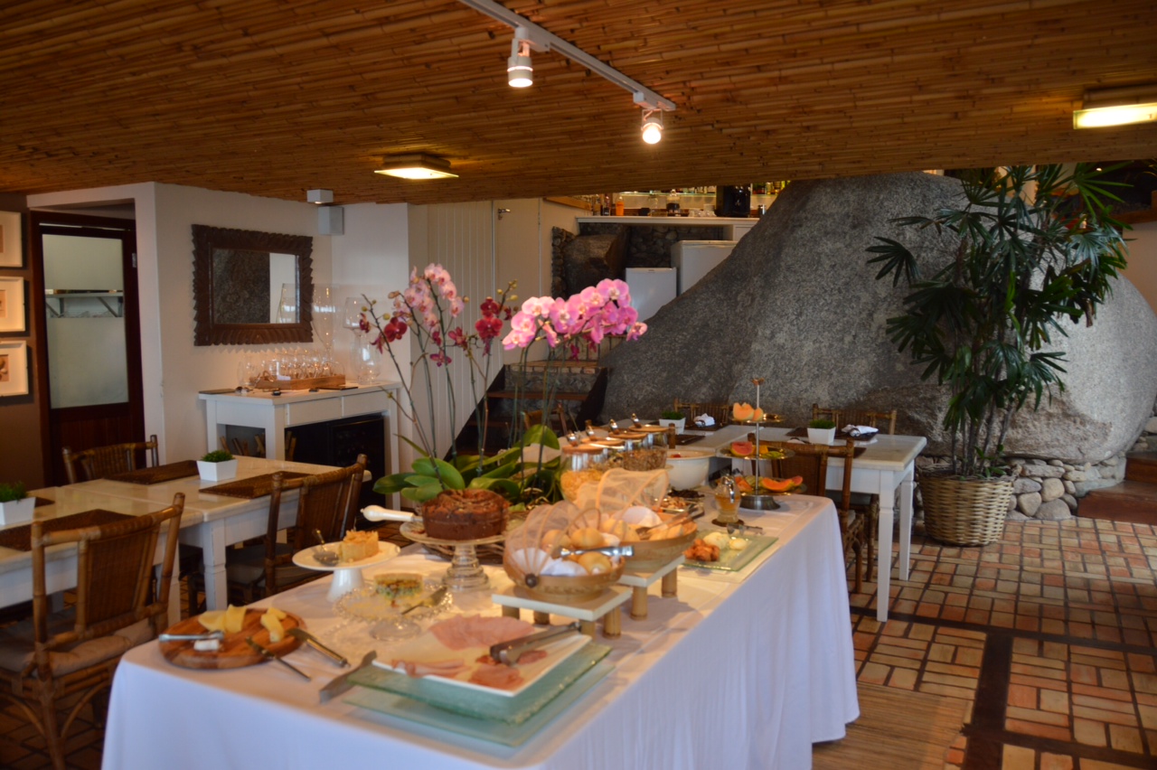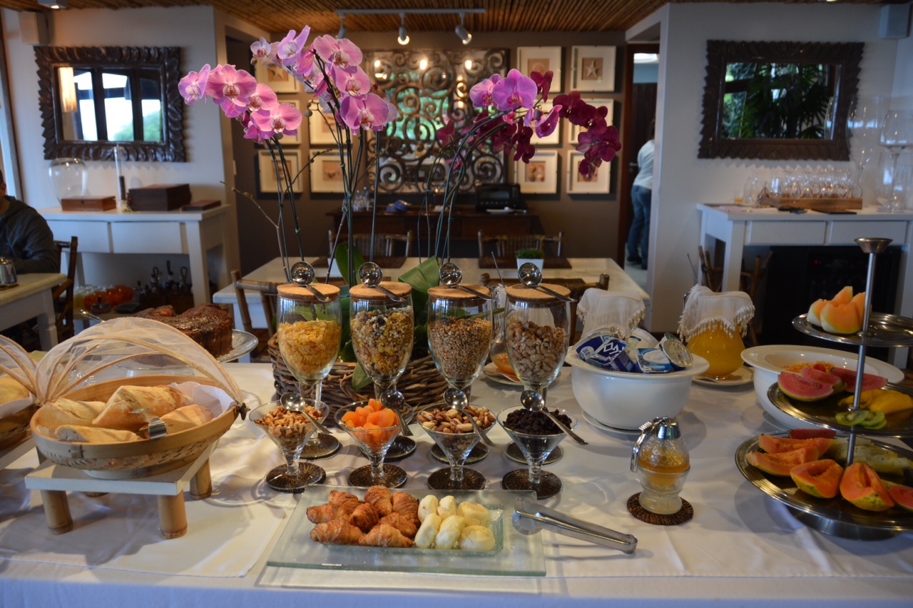 O café da manhã é uma delícia, servido no restaurante do hotel, o Bistrô da Varanda, com vista para o mar. Sucos naturais, frutas, bolos, waffles, quiches, queijos franceses e italianos, geléias produzidos em casa, artesanalmente, dentre outras delícias, são servidos até 12h. Um luxo!!!