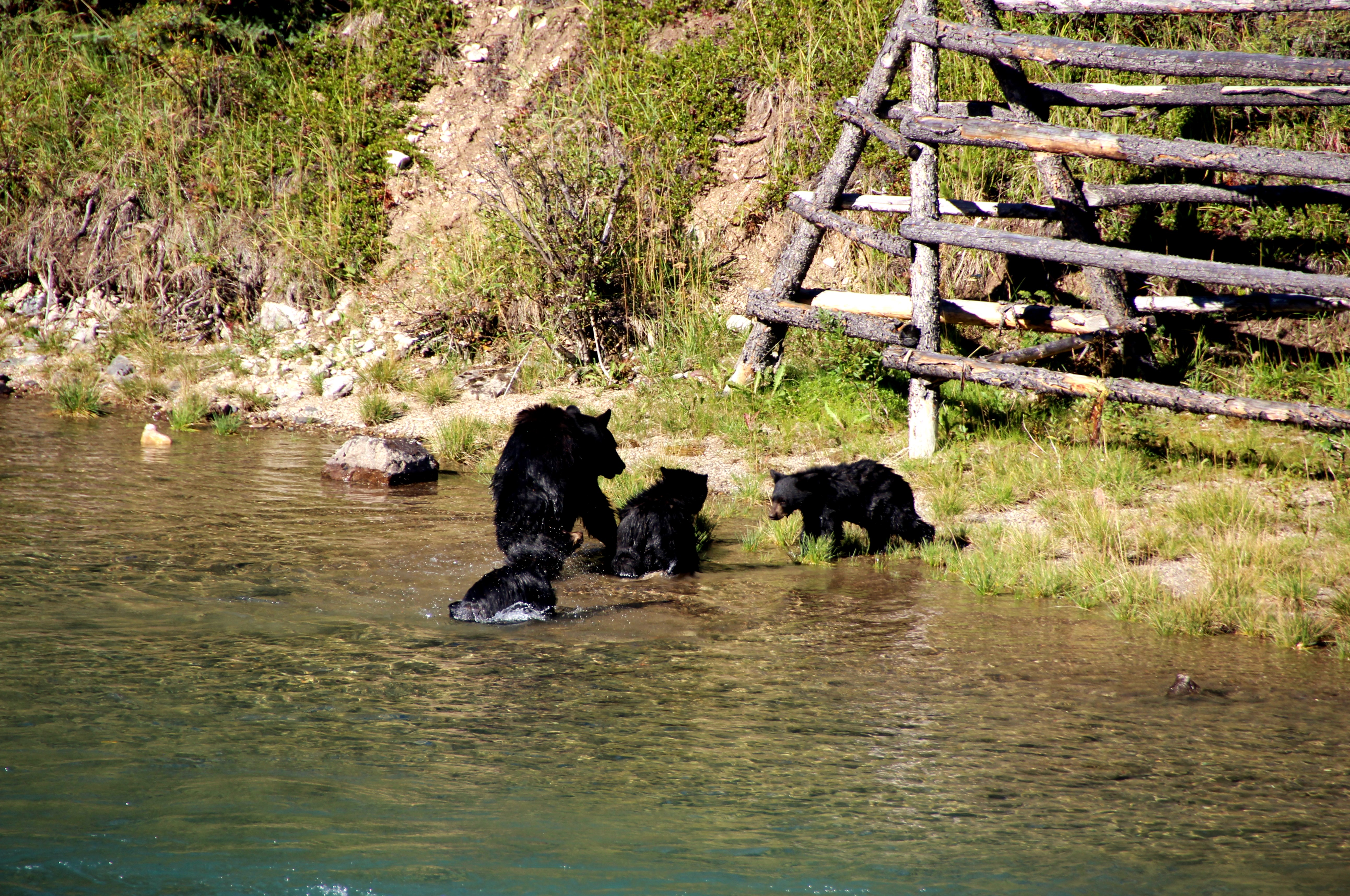 Ao voltarmos, depois de muito remar (e sentir que não saíamos do lugar), tiramos nosso cooler do carro e fizemos um pic-nic para o almoço. Depois, resolvemos caminhar um pouquinho até o Moose Lake, um outro lago ali pertinho – mas não valeu muito a pena. A melhor parte dessa caminhada, na verdade, foi a sorte que demos ao ver uma família de 4 ursos (o que deduzimos ser a mãe e três filhinhos) descendo de uma árvore e tentando atravessar para o outro lado do Maligne River, o rio que parte do Maligne Lake. Estávamos na ponte em frente ao lago quando os vimos. Eles passaram por debaixo da ponte várias vezes (a mãe até subiu na ponte e ficou ali, cara a cara com o turistas – veja nas fotos abaixo – mas não apresentou perigo algum). Depois, eles resolveram atravessar o rio, mas um dos filhotes foi levado pela correnteza. É incrível como esses bichinhos são fortes, pois ele conseguiu nadar contra o curso do rio e chegar até a família na margem do outro lado. Foi sensacional ver aquilo tudo acontecendo ali, na nossa frente! Tiramos muitas fotos – junto a um aglomerado de turistas que os admirava também!