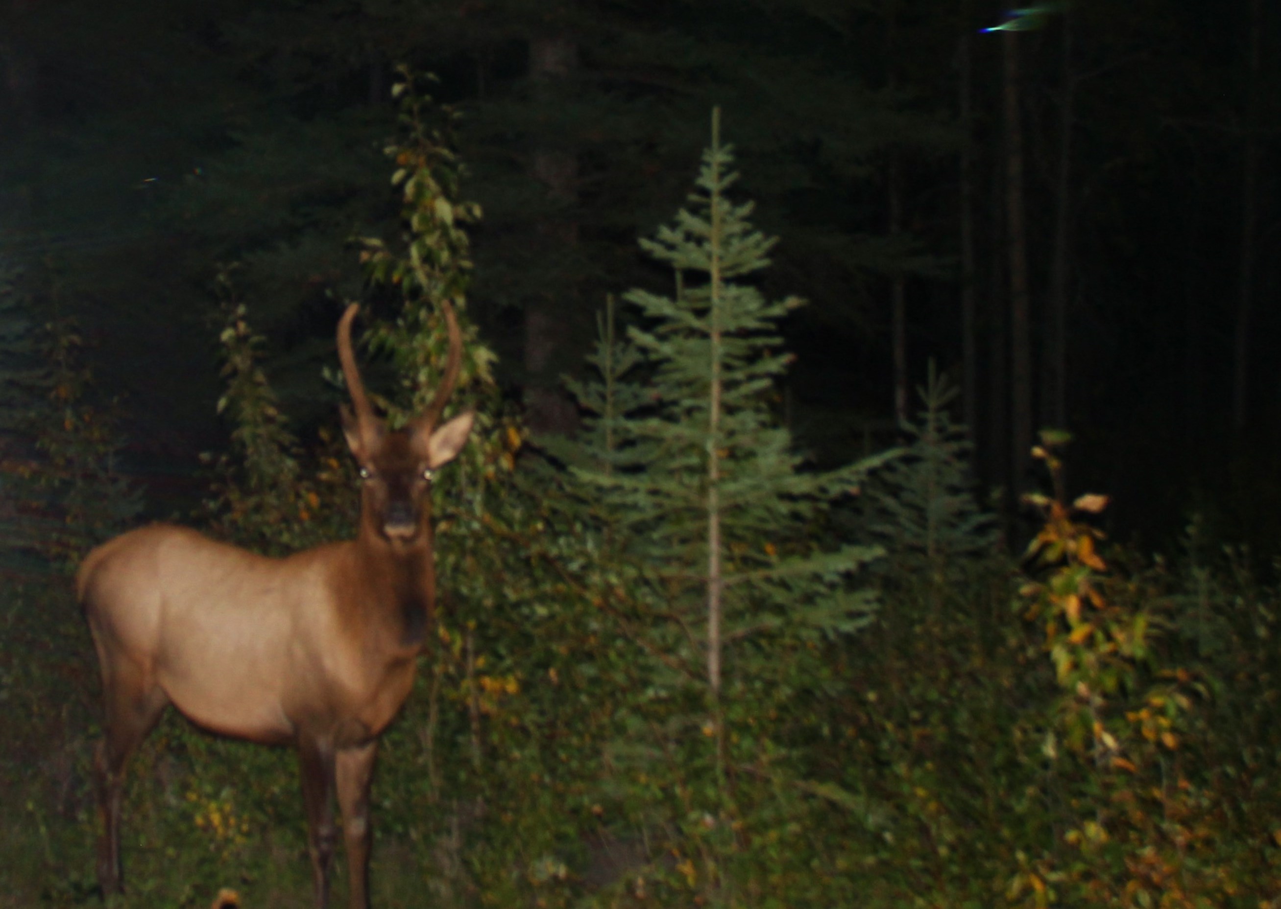Demos a volta com o carro e quando paramos: SURPRESA! Havia luzes verdes no horizonte, que por cerca de 10 minutos ficaram variando de intensidade. Não podíamos acreditar na nossa sorte. Era a Aurora, bem ali, na nossa frente. A intensidade nem se compara com as fotos clássicas que vemos por aí, mas a primeira vez a gente nunca esquece! 🙂 Tentamos muito fotografar o fenômeno, mas não conseguimos. Ainda precisamos aprender a configurar a câmera para isso. Se alguém ai souber como fazer, por favor, divida com a gente aqui nos comentários! Voltamos para a rodovia a caminho de Jasper e nos encontramos com dois amiguinhos nas margens das florestas. Só conseguimos fotografar esse curioso aí ao lado, que ficou nos observando.
