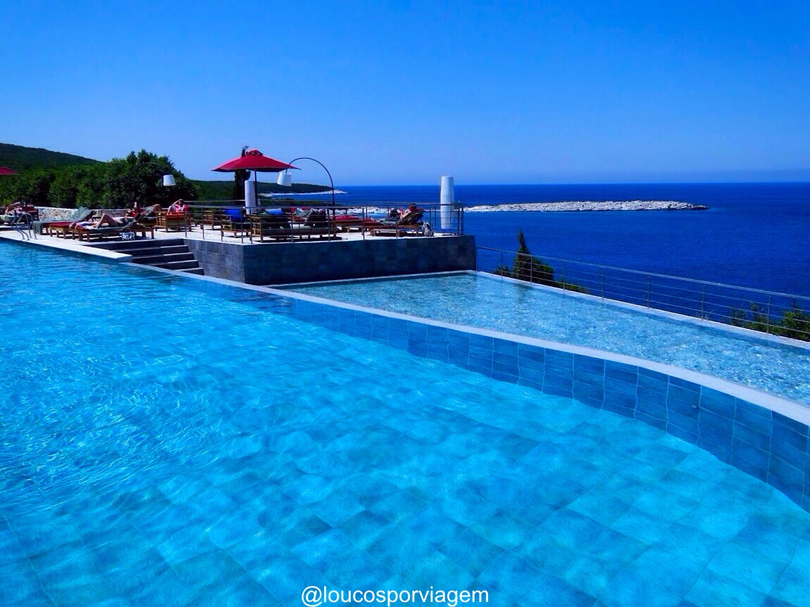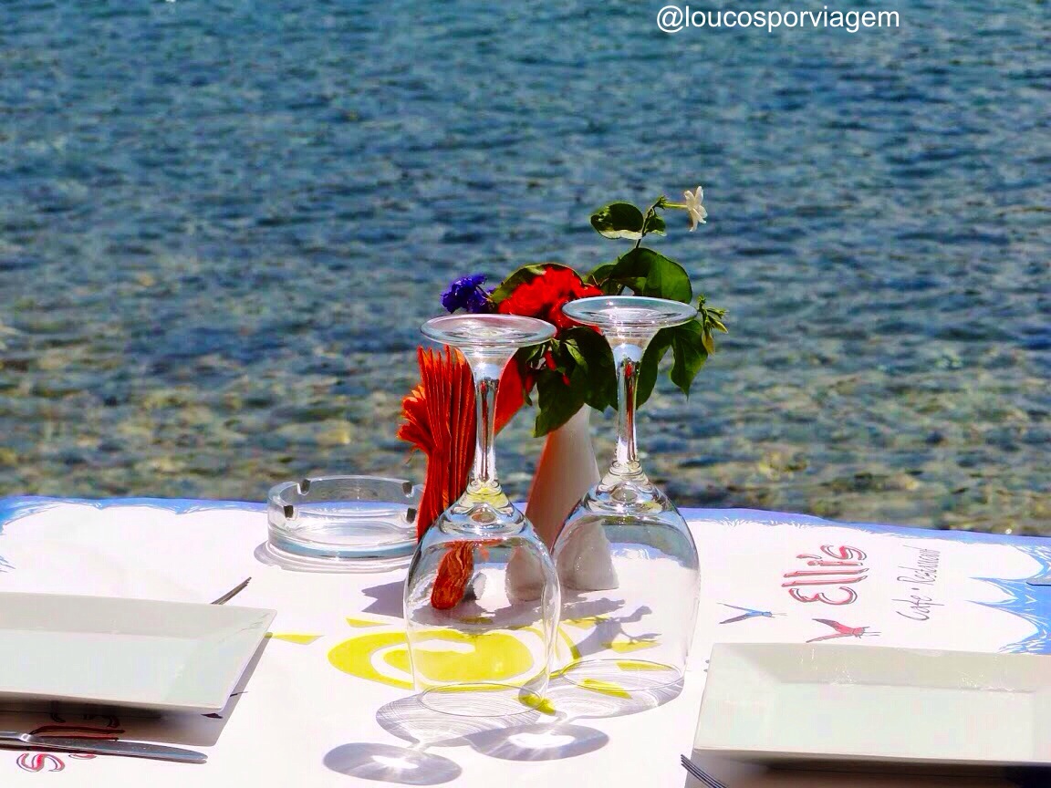 Ao ar livre, com vista para o mar jônico, vendo o sol se pôr! Sempre que estávamos na área da piscina ou do restaurante, os funcionários do hotel colocavam música brasileira para nos agradar. Achei uma gracinha o mimo!