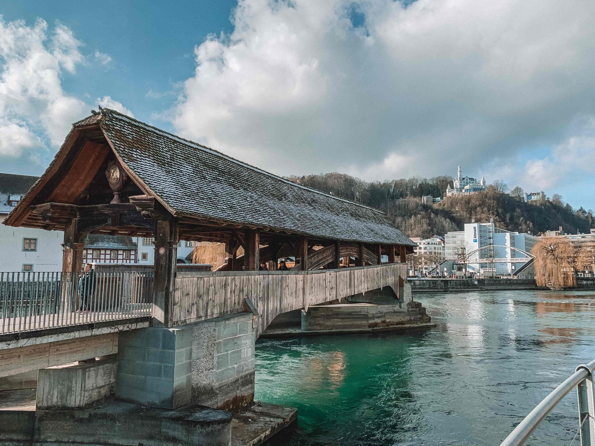 A ponte da capela é praticamente o cartão postal da cidade e mesmo que você não queira você vai passar por ela. Linda, está sempre movimentada, sempre! Quase no meio da ponte está a Wassertum (Water Tower), uma torre de 43 metros de altura, construída em 1303, que já foi usada como tesouraria, prisão e até área de torturas, mas pelo que me falaram nunca como caixa d’água (hehe). Ela está sobre o rio Reuss.