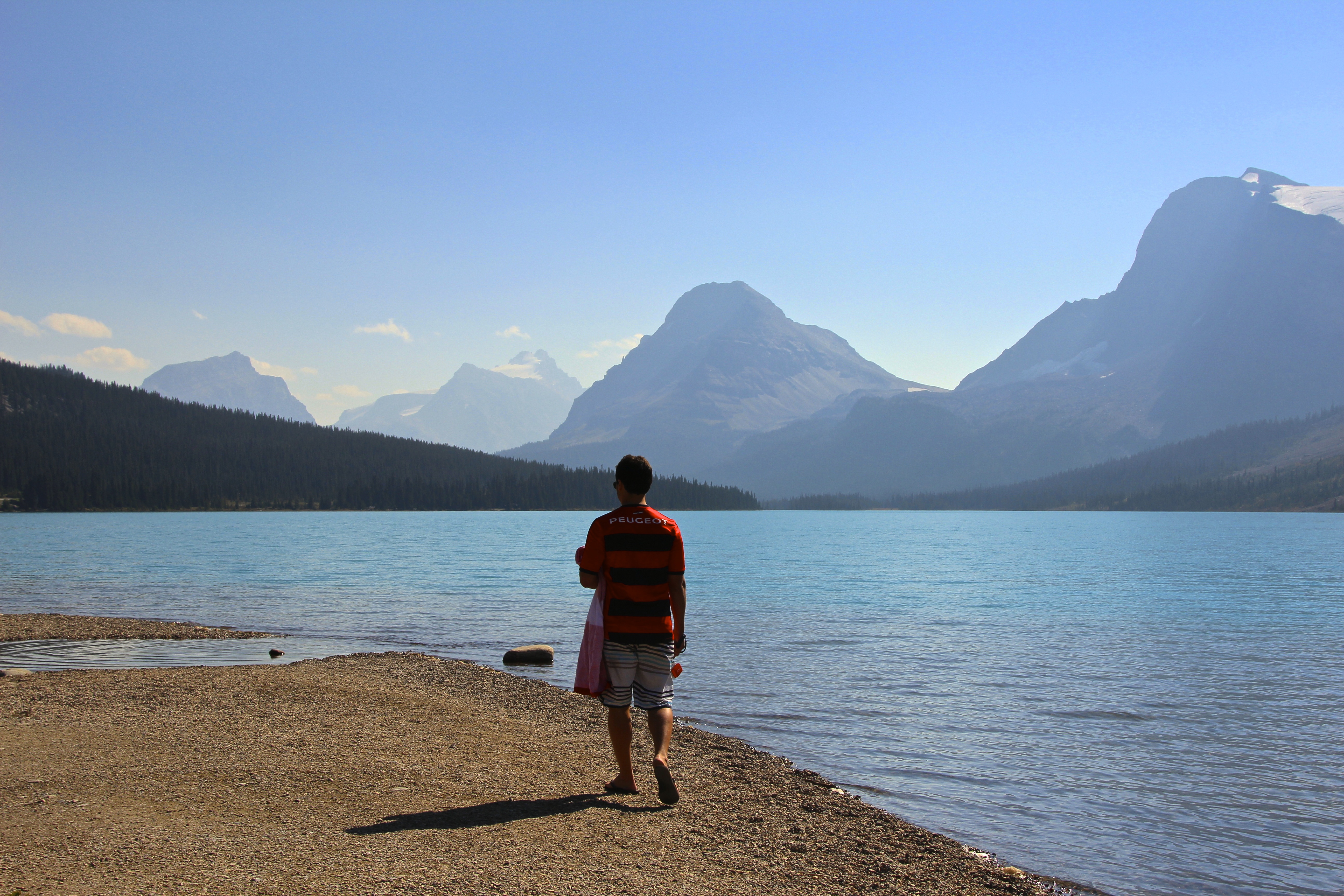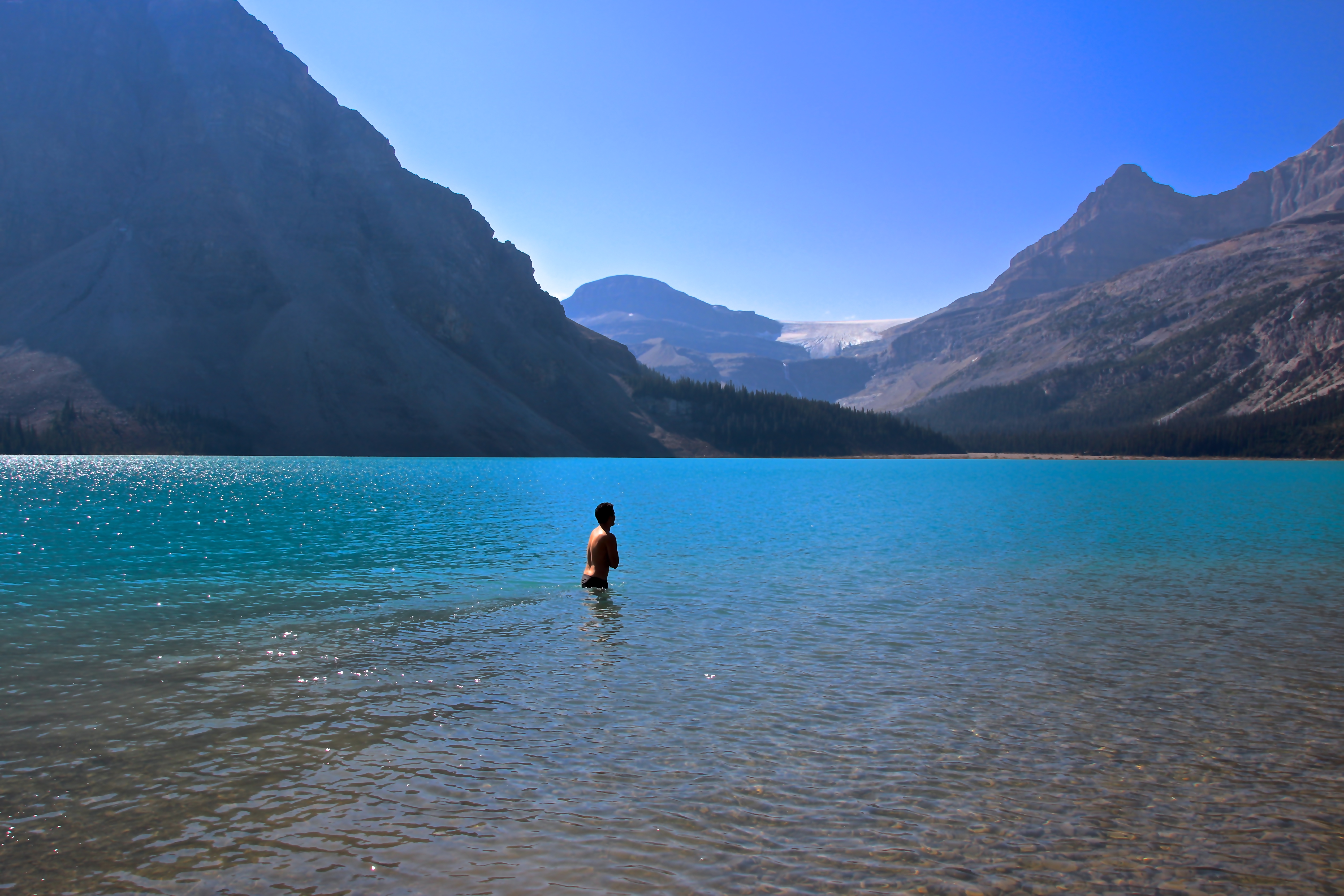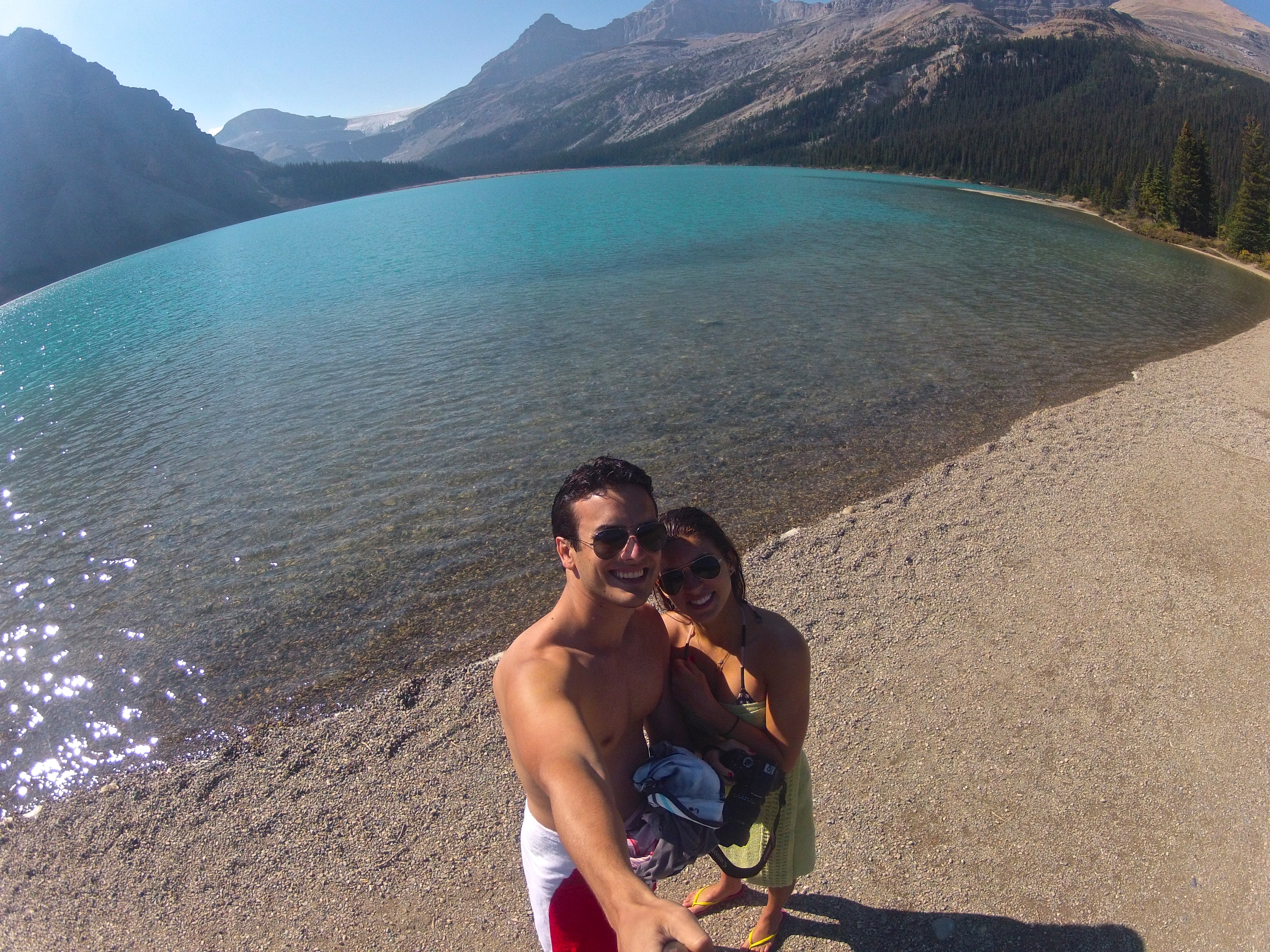 Na volta, apesar do dia não estar muito quente, o sol estava forte e nós resolvemos dar um mergulho no Bow Lake depois de toda aquela caminhada. Nada de ter medo de água fria! 😉 Podem entrar confiantes que o mergulho é revigorante!