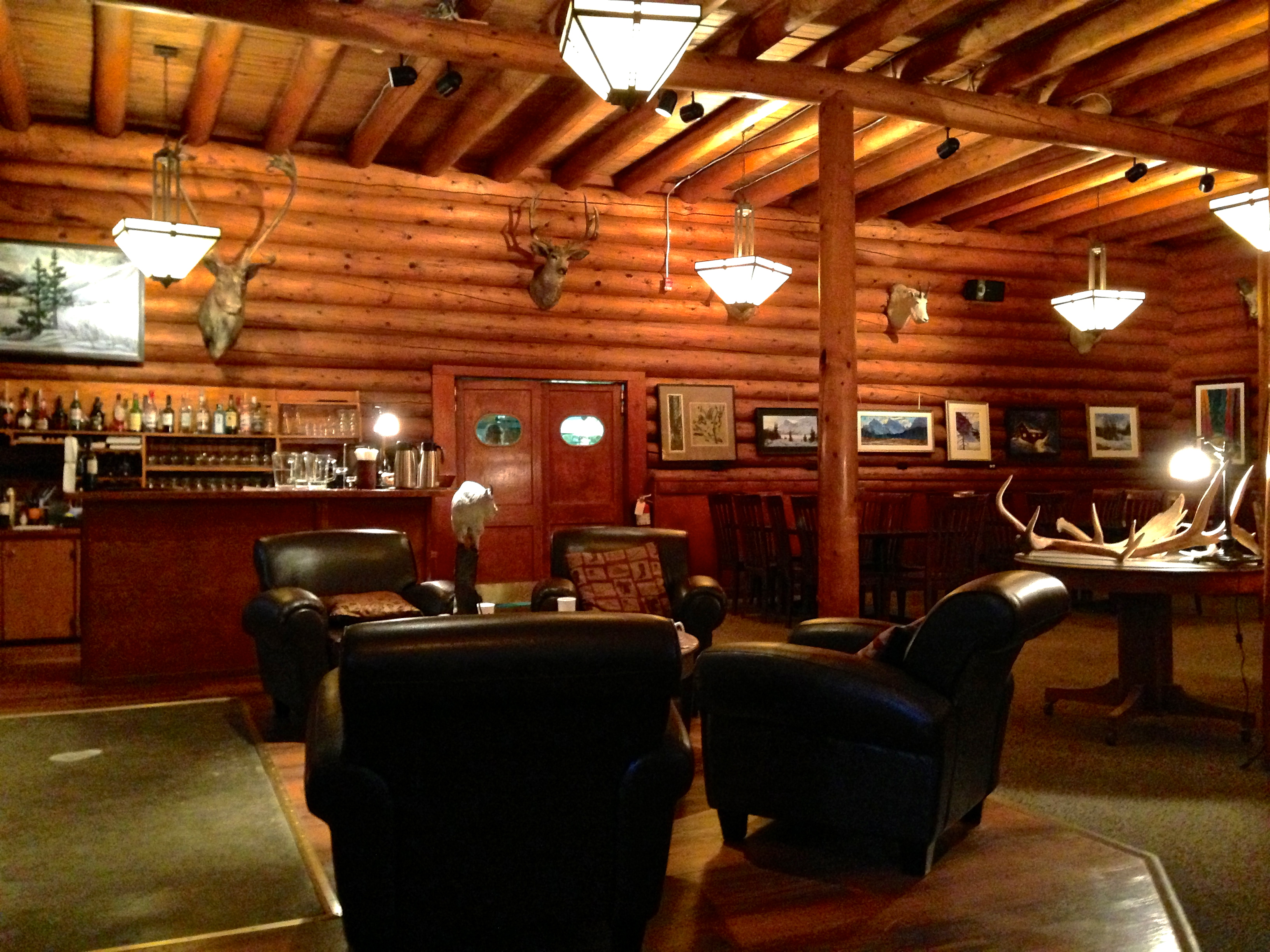 A sala de estar também é muito aconchegante, além de ter um segundo ambiente com uma mesa de sinuca para os hóspedes se divertirem. Todo o lodge tem aquele estilão de cabana nas montanhas: todo de madeira, com grandes poltronas confortáveis e várias cabeças de animais empalhadas presas à parede.