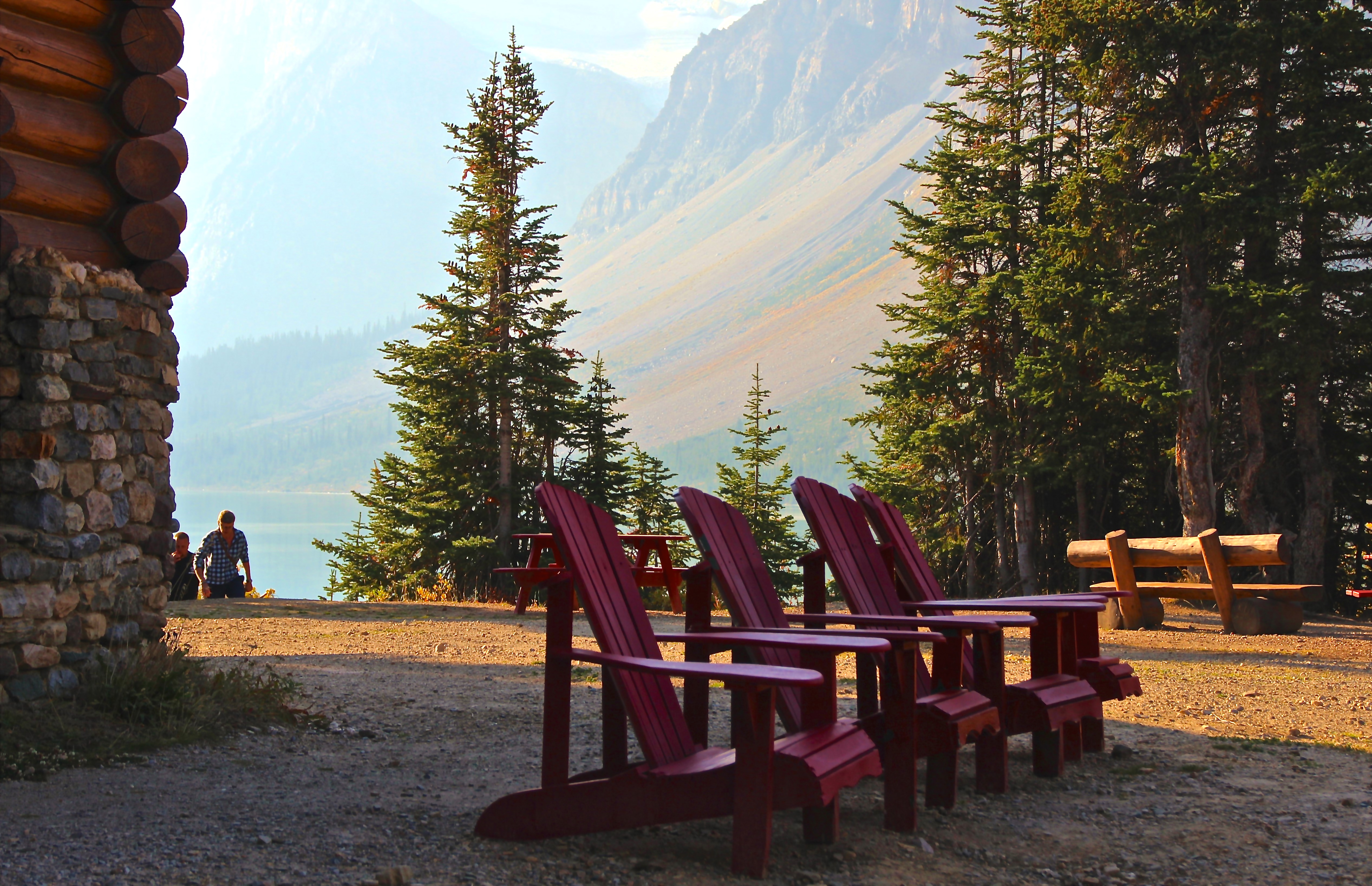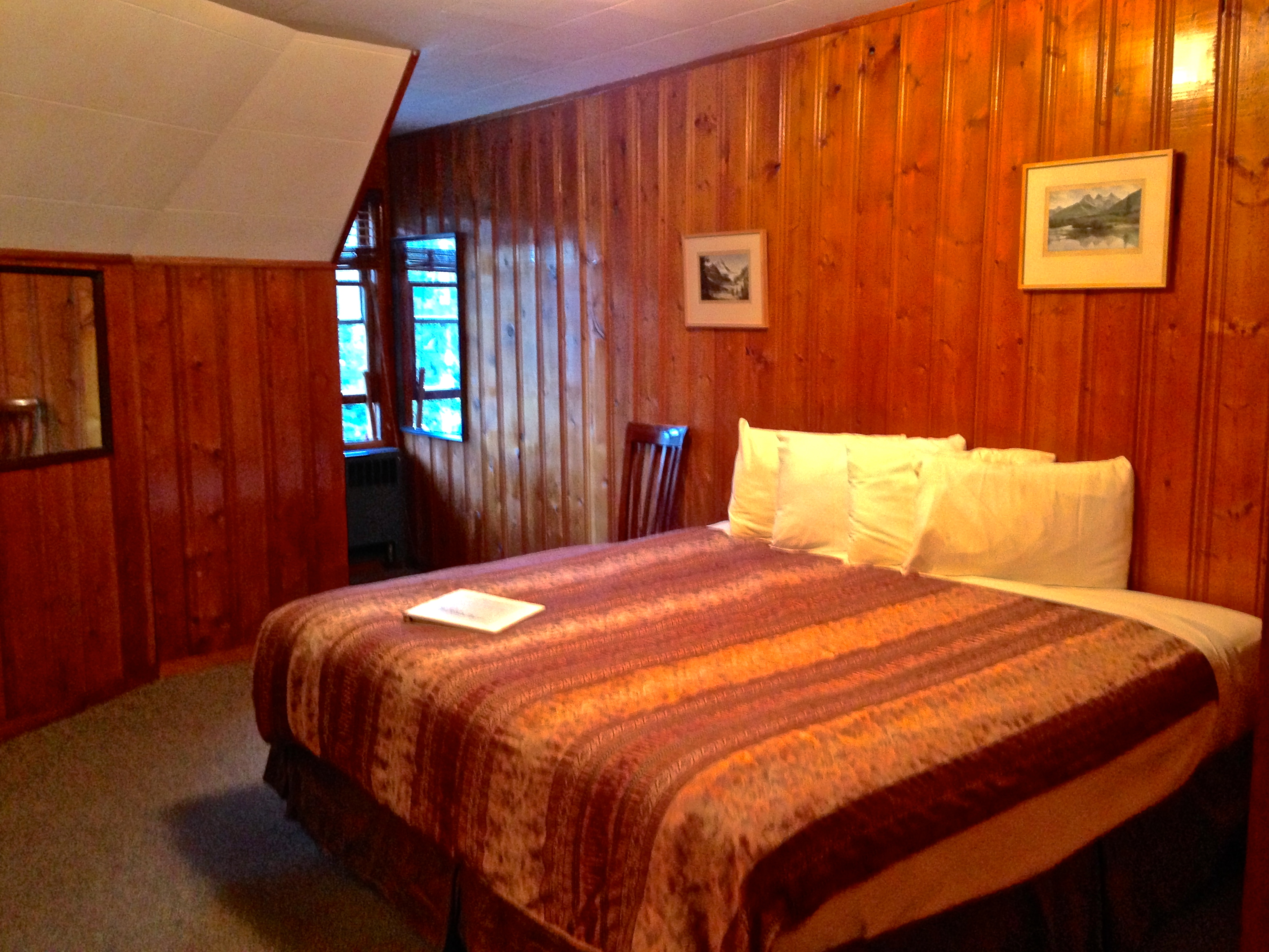 Atualmente são 16 quartos, alguns com vista para o lago, outros com vista para a montanha. Tivemos a sorte de conseguir um com vista para o lago, apesar da janela ser bem pequenina. É importante frisar o que mencionamos a pouco: o hotel não passa por grandes reformas desde a década de 50. Sendo assim, o ambiente é rústico e a construção do Lodge é antiga. As paredes são finas, os banheiros pequenos e não há elevador para te levar ao três andares que ele possui. O quarto também é simples, mas em momento algum nos faltou conforto; muito pelo contrário: num ambiente como aquele, com um belíssimo contato com a natureza, a última coisa que queríamos era um hotel imponente e moderno. A ideia de conhecer um pouquinho da história e da cabana da família Simpson nos parecia perfeita – e foi. Ainda mais com o Bow Lake exatamente à nossa frente. Acreditem: ele é ainda mais bonito ao vivo que nas fotos! 🙂