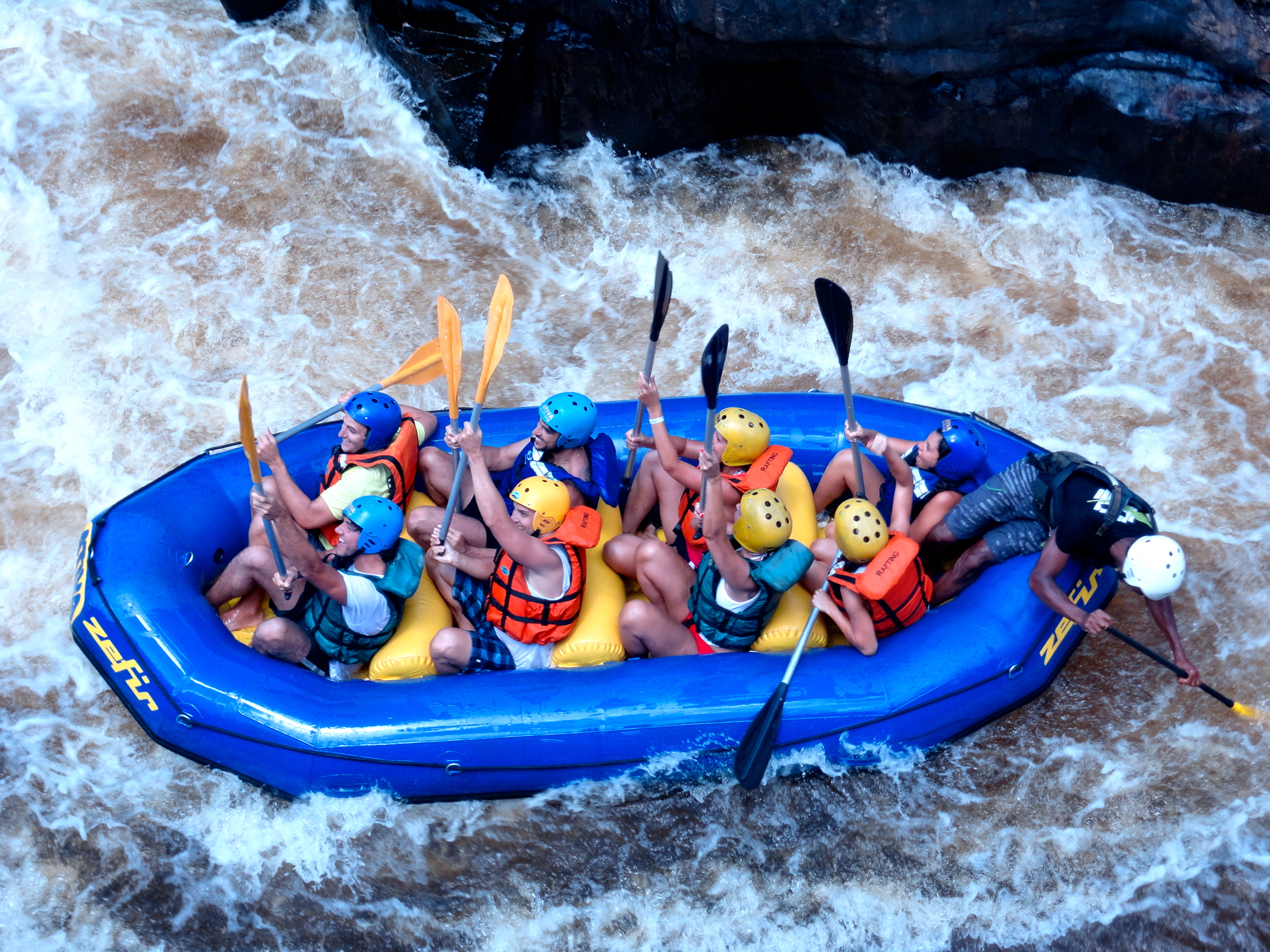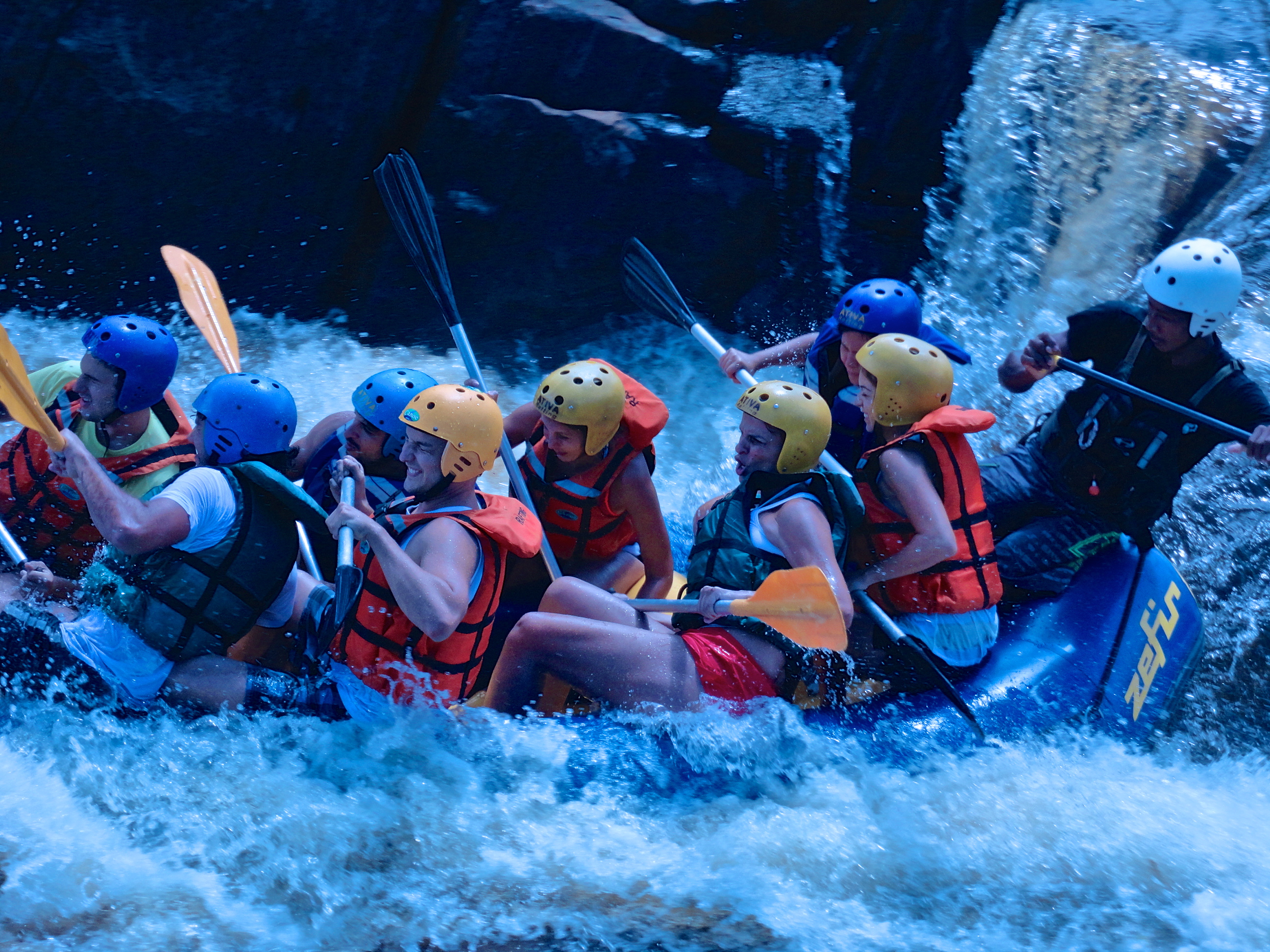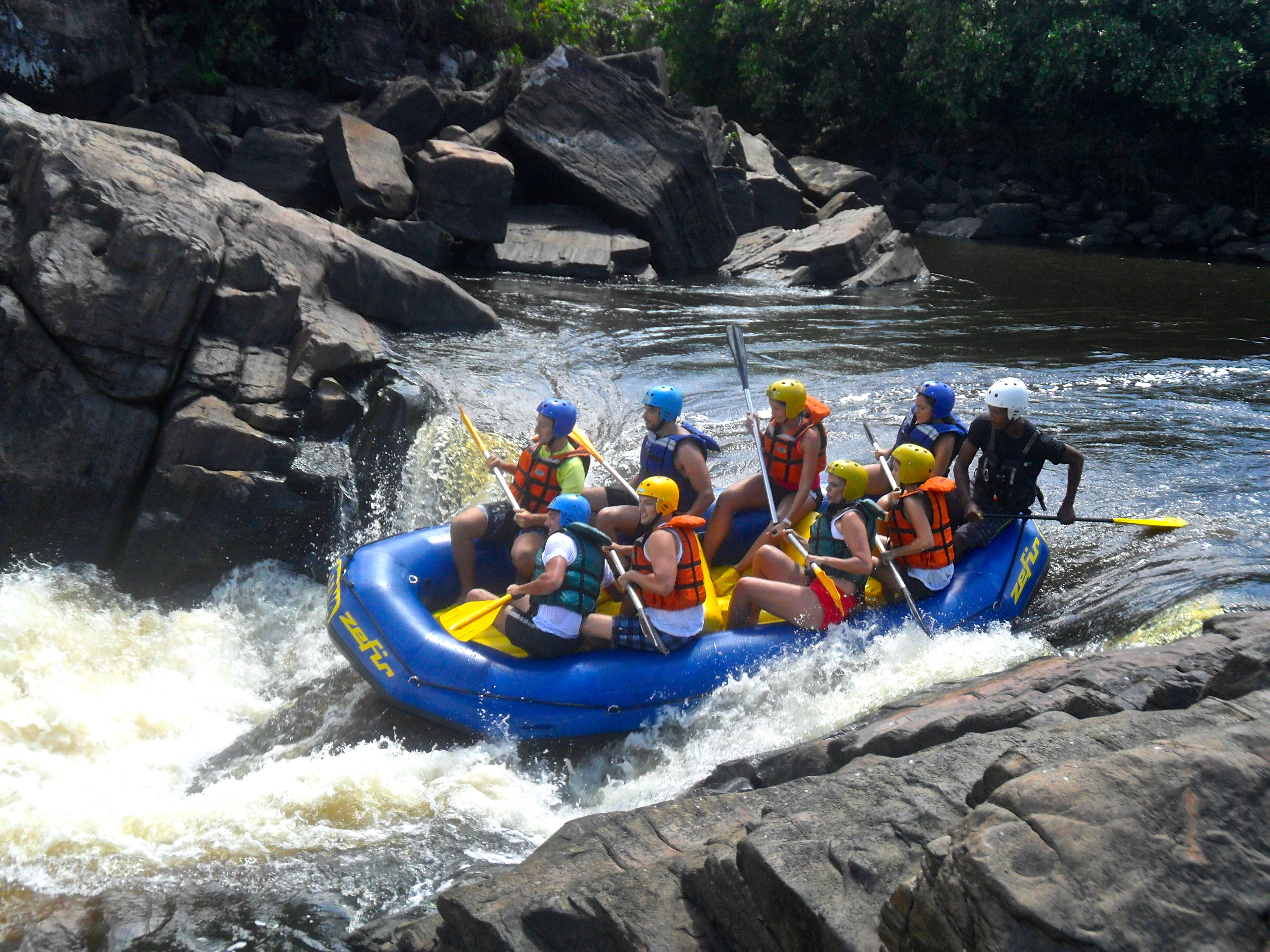 Feito o briefing inicial e a divisão dos grupos, era hora de entrar na água! O rafting no Rio das Contas tem corredeiras de níveis 3 e 4, podendo aumentar na época de chuvas. O trajeto percorrido levou cerca de uma hora e meia, passando por quatro diferentes corredeiras. Quando fomos, a chuva havia dado trégua já fazia uns 10 dias então o rico não estava muito cheio; os mais experientes na prática de rafting podem achar, nessas situações, o passeio muito fácil (para nós, foi bem divertido. Se a dificuldade não é das maiores, o mesmo não se pode dizer da beleza do local: passamos por dentro de um pequeno (e bem estreito) cânion e pudemos observar a flora e a fauna da região, com plantas nativas da mata atlântica e passarinhos coloridos.