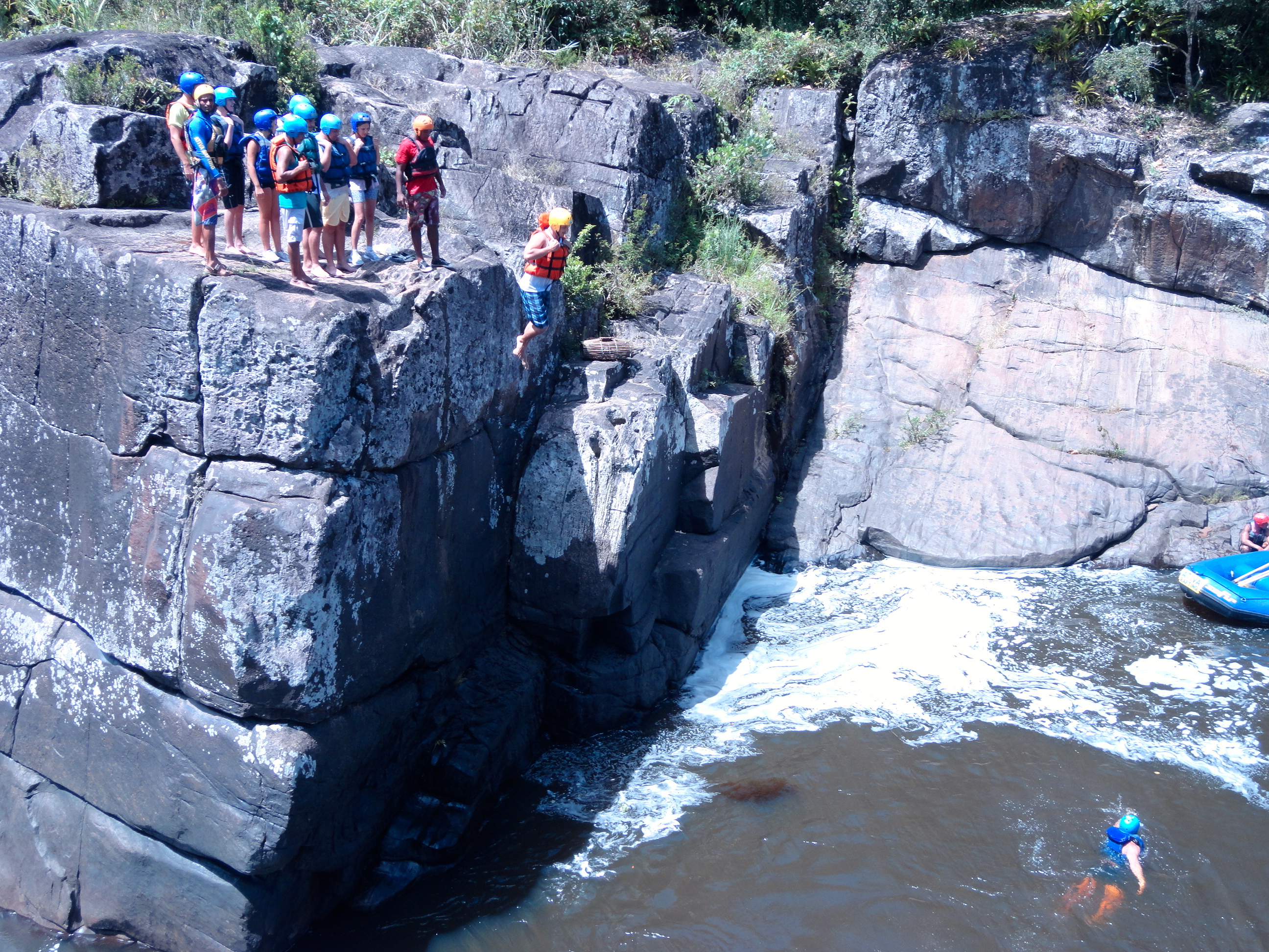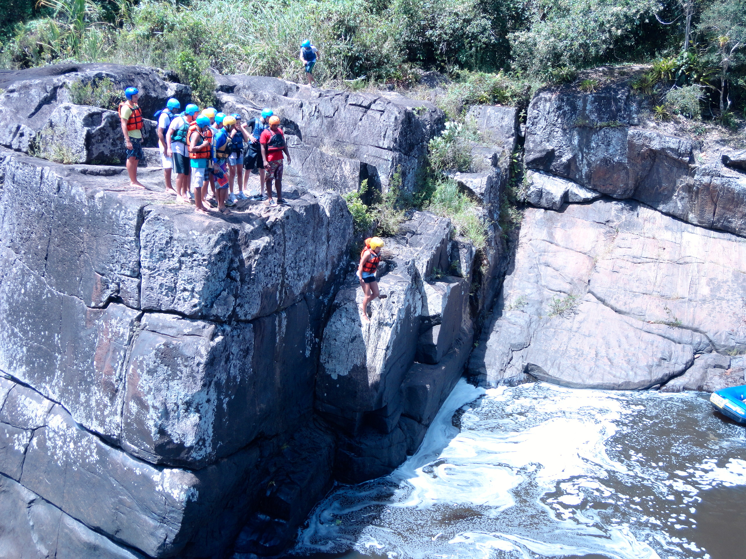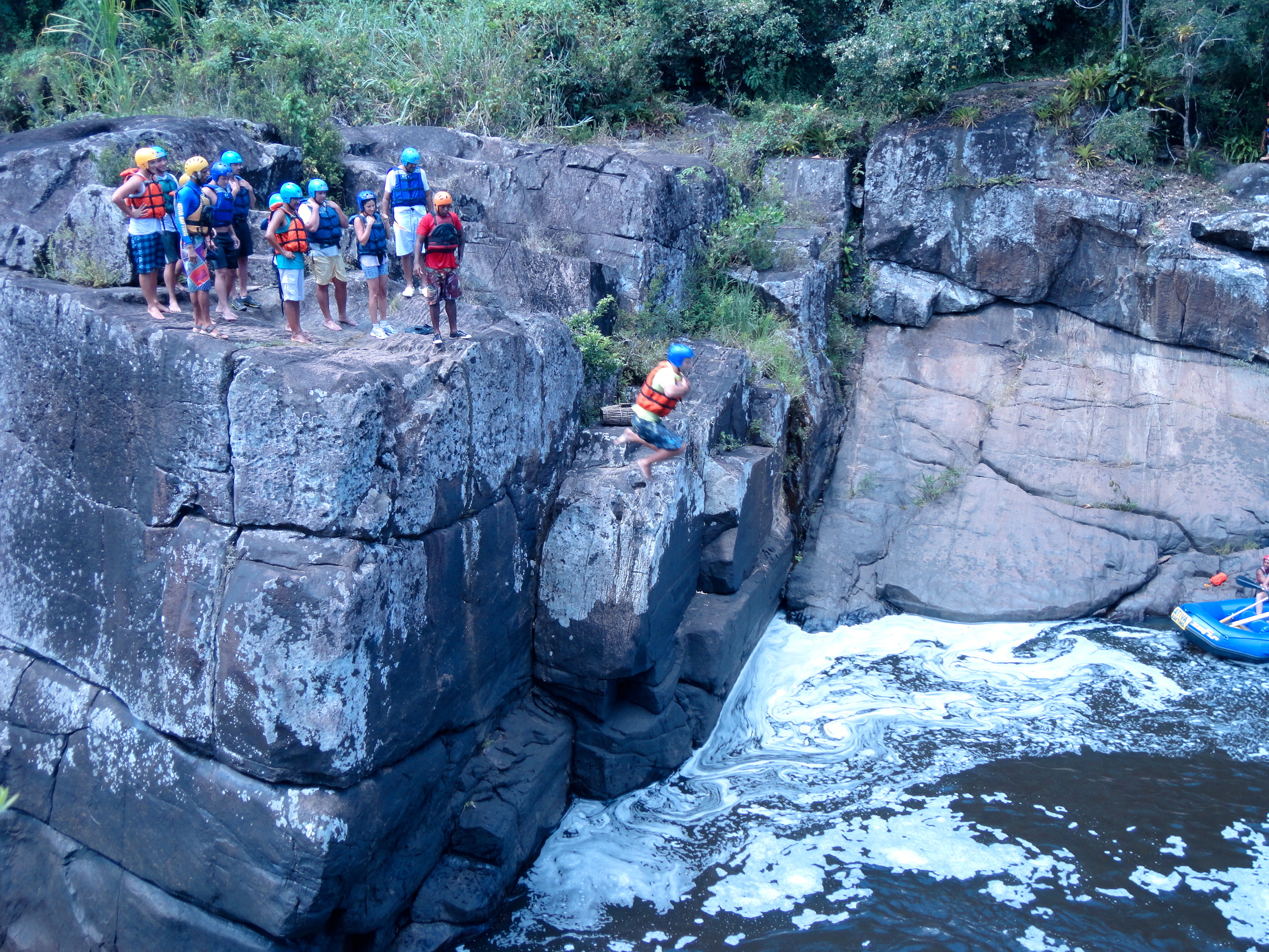 Um dos pontos altos da aventura é o momento em que paramos no meio do cânion e saímos do bote para saltar de uma pedra de 8 metros de altura – esta parte é opcional e os menos aventureiros podem observar os saltos no conforto do bote!