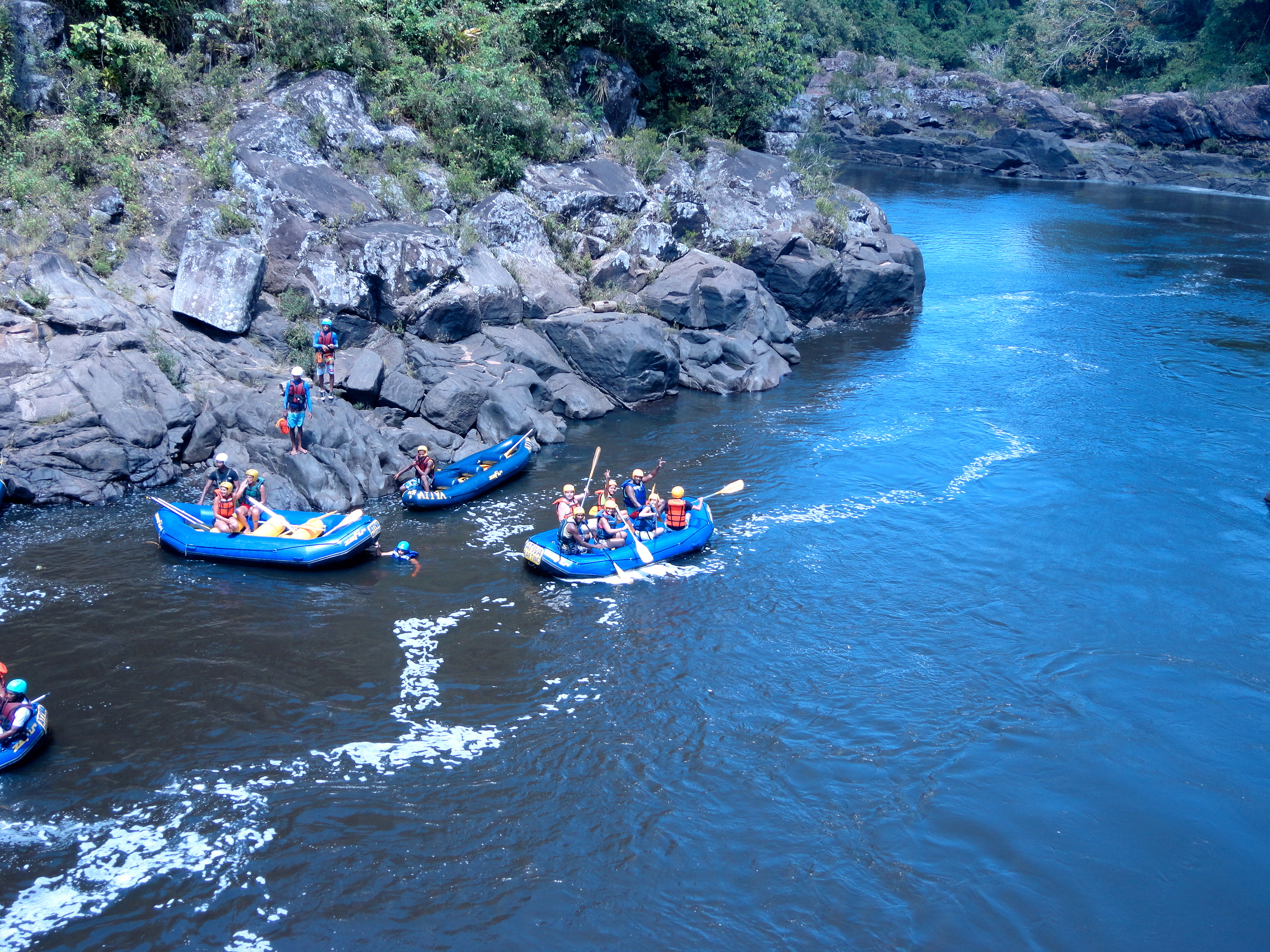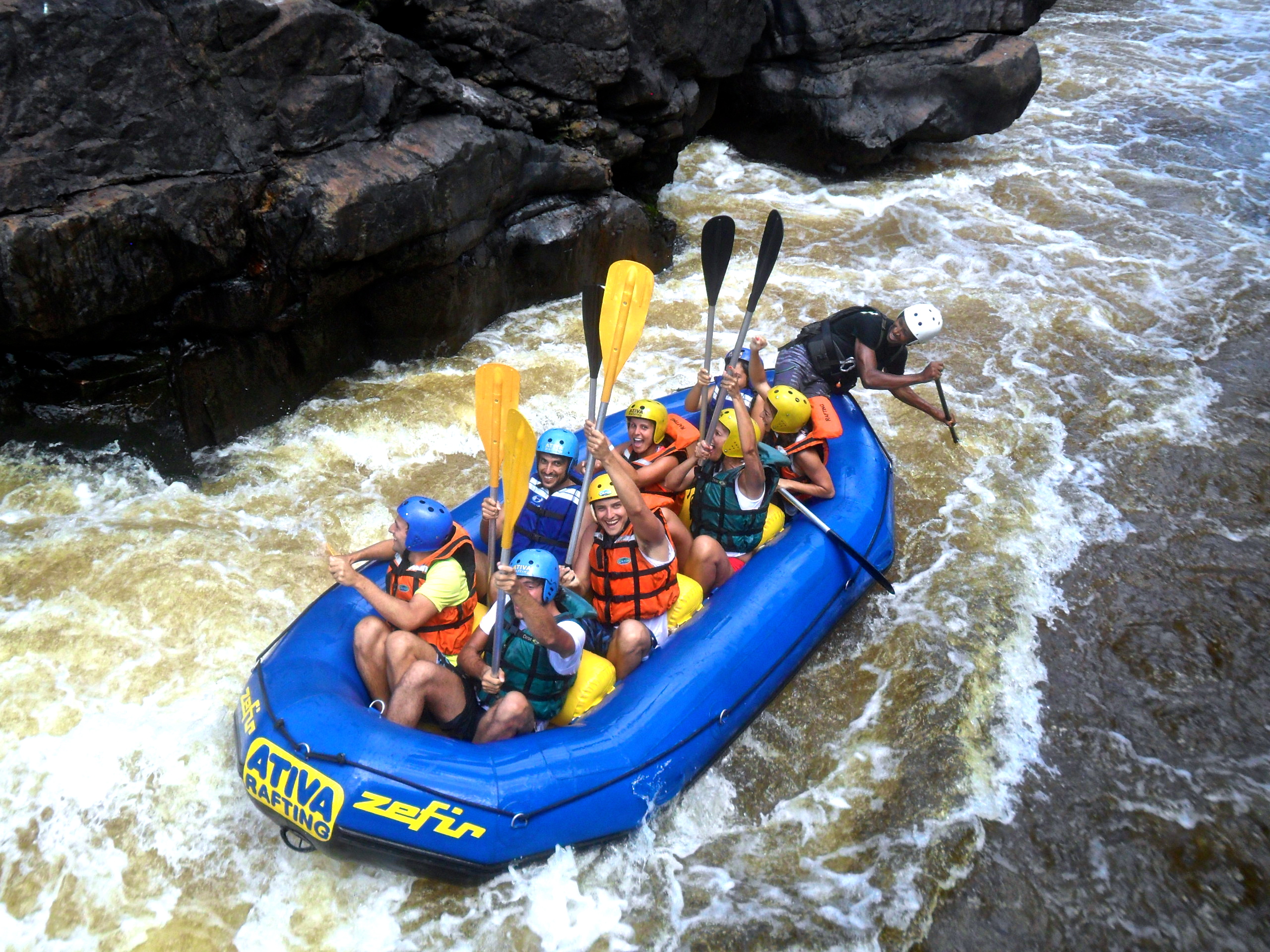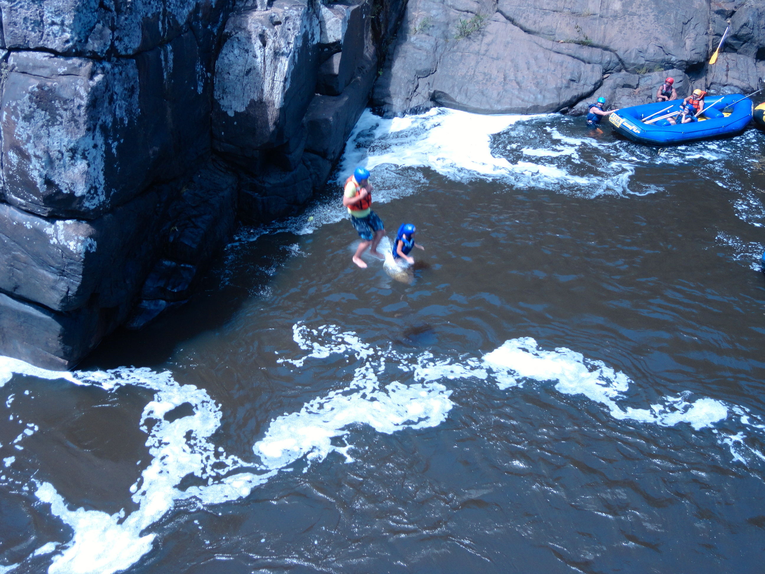 Um dos pontos altos da aventura é o momento em que paramos no meio do cânion e saímos do bote para saltar de uma pedra de 8 metros de altura – esta parte é opcional e os menos aventureiros podem observar os saltos no conforto do bote!