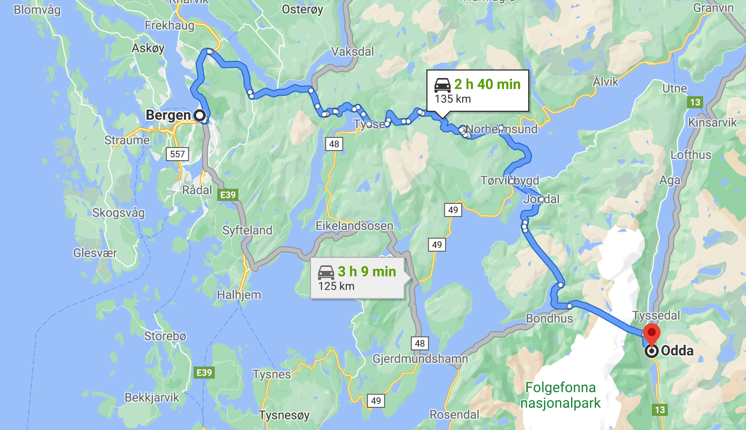 O trajeto mais otimizado de carro desde Bergen até Odda inclui um ferry (para atravessar o trecho Tørvikbygd-Jondal), que dura 20 minutinhos. Fique atento que, se não me engano, o ferry sai apenas de hora em hora, na hora e 50 (ex: 07h50, 08h50…)