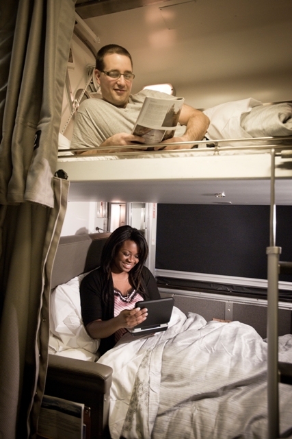 Logo após o jantar, fomos aos nossos assentos e nos deparamos com uma super beliche, camas amplas e arrumadinhas, e uma cortina as separando do corredor (na classe “Sleeper Plus”, as cadeiras são transformadas em camas à noite). Adoramos! Dormimos super bem!
