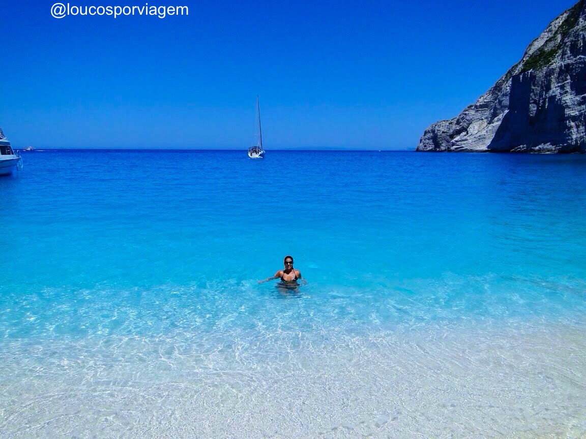 A chegada na Navagio Beach é surpreendente. A praia é uma enseada de areias brancas e águas cristalinas! Sem contar o tom de azul, sem dúvidas o mais bonito que já vi!!! Como falamos acima, nas areias da praia está um antigo navio naufragado.